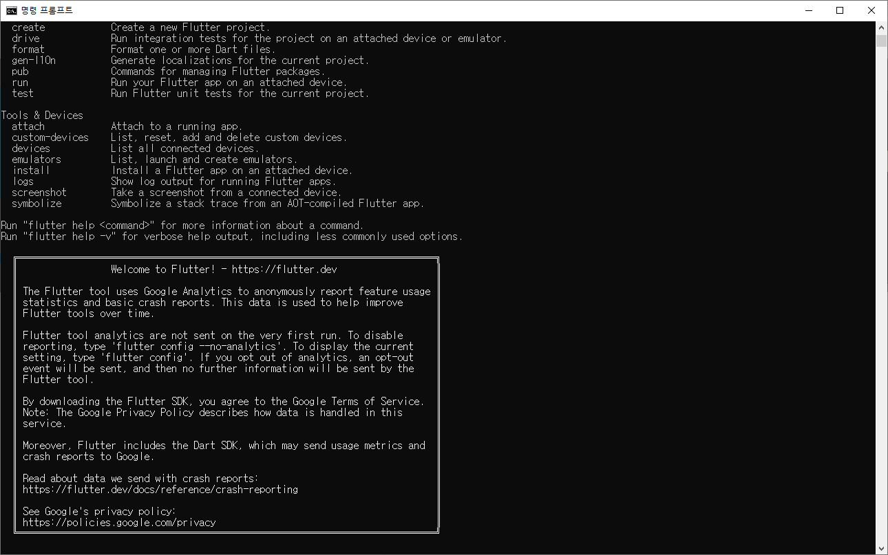 3. 설치 확인 cmd창에 flutter 입력