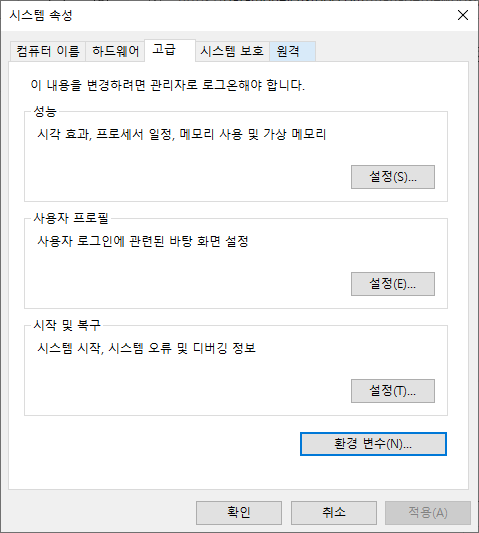 제어판 > 시스템 환경 변수 편집