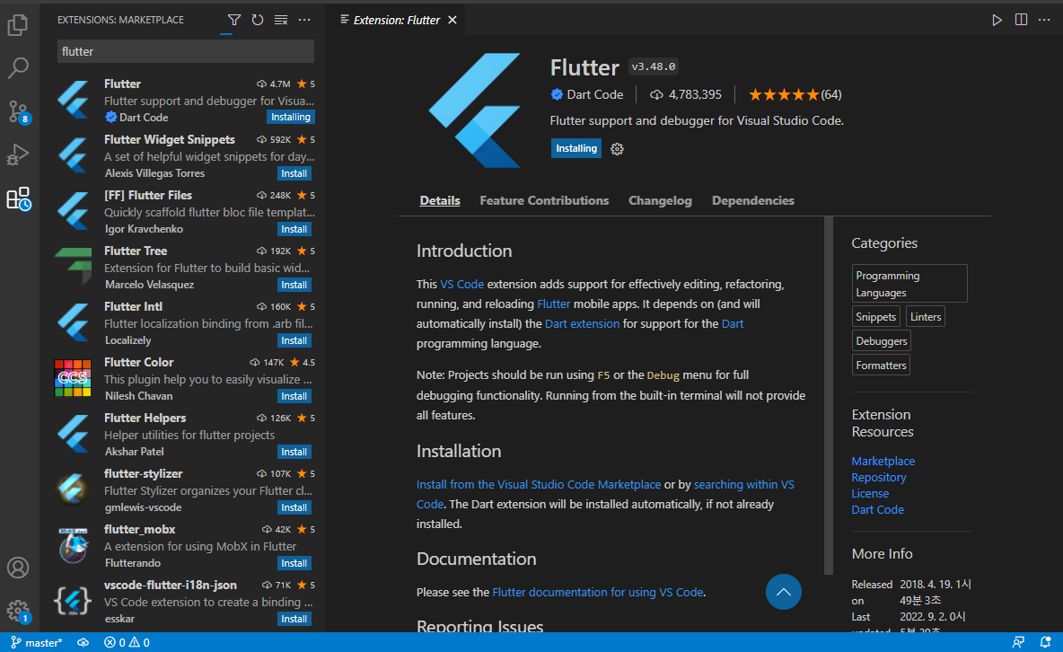 flutter 개발을 vscode로 진행하려면 flutter와 dart를 다운받아주기만 하면 된다.