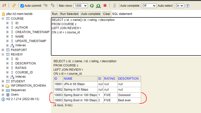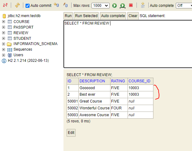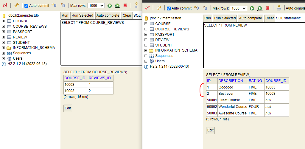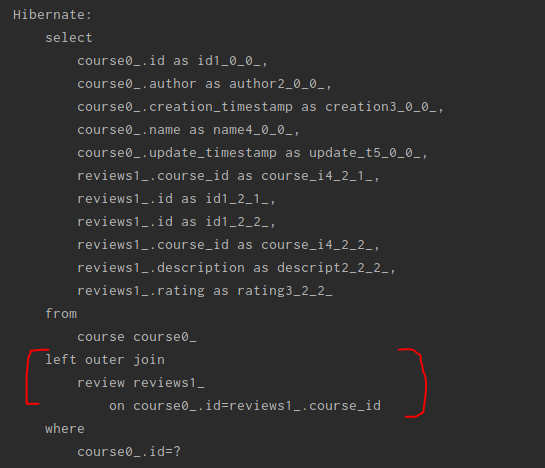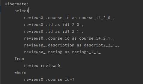 course는 LAZY이기 떄문에 바로 review를 찍어낼 수 없고 각각의 테이블로 두번 select 요청을 보내 해당 course_id에 해당하는 review를 가져오게 된다.