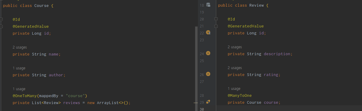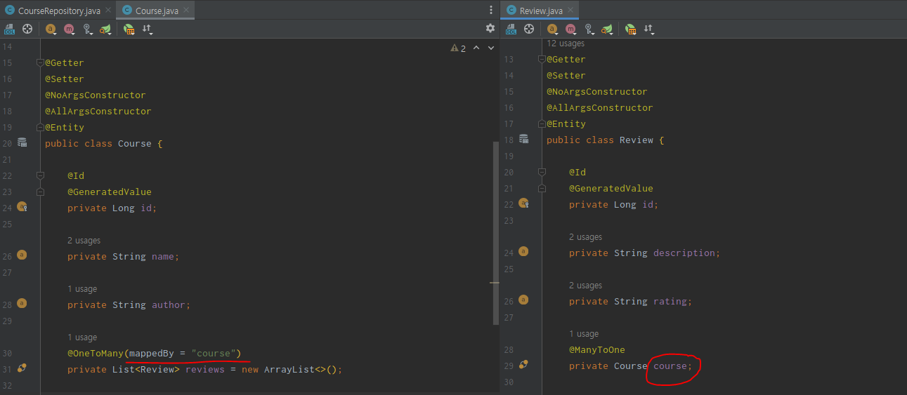 강의 > 리뷰 @OneToMany로 강의는 List<Review>를 갖는다.