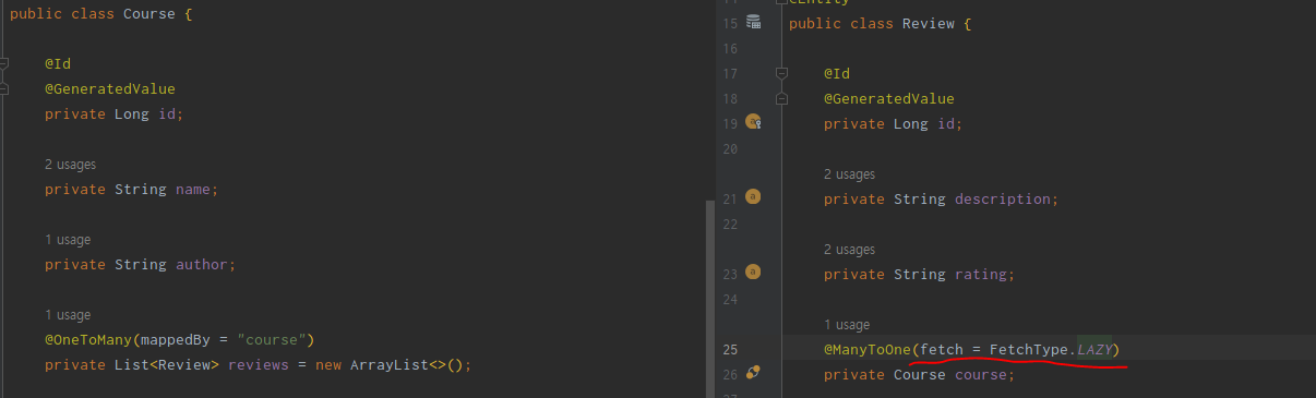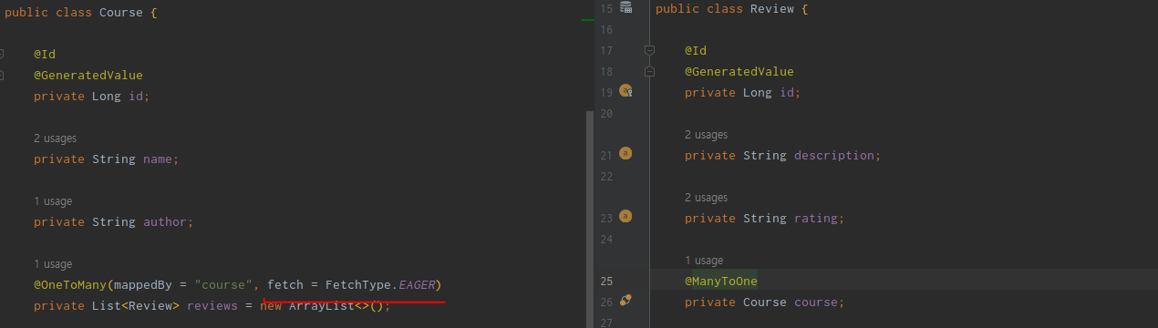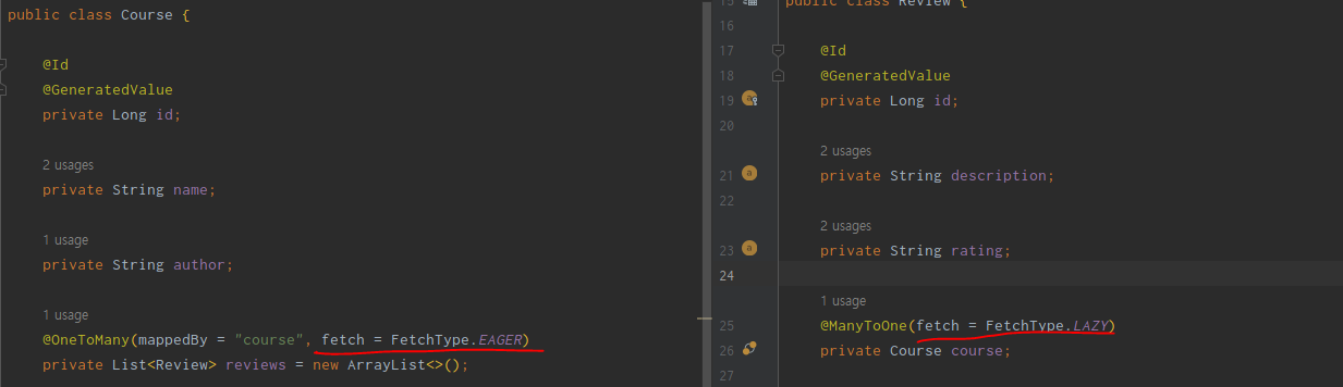 하나의 Course에 딸린 Review들을 EAGER하게 가져오고 반대로는 LAZY하게 가져오도록 설정해줬다.