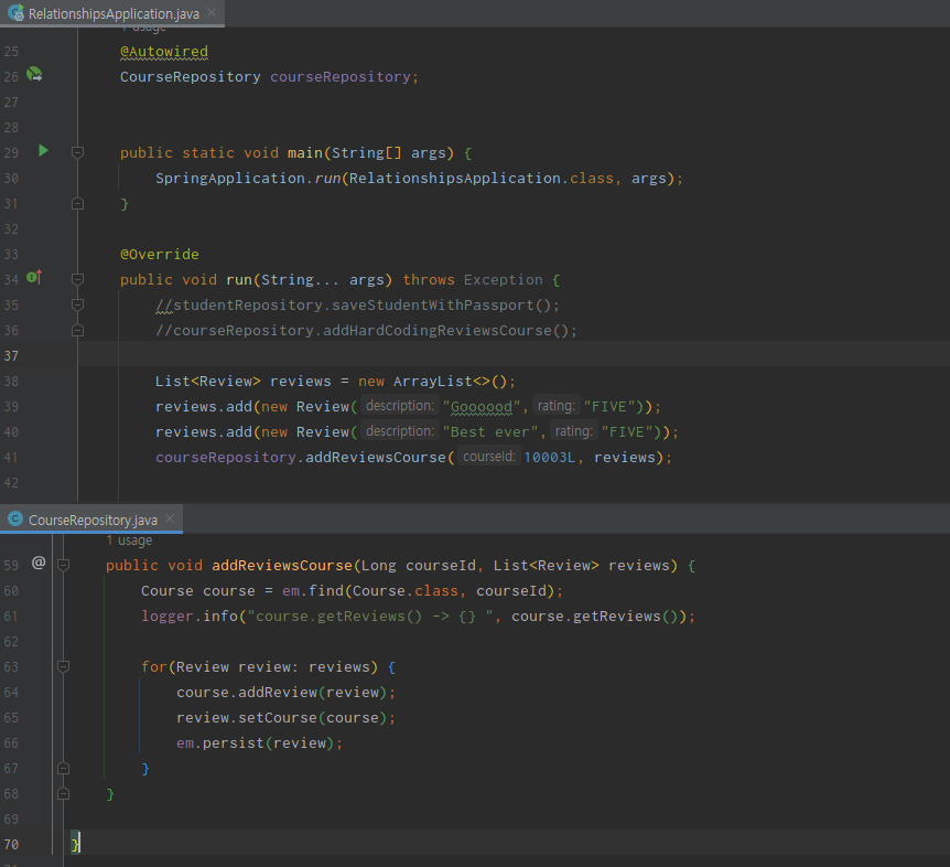 CourseRepository에 특정 Course에 Review를 한번에 저장하는 간단한 메소드를 만들어줬다.