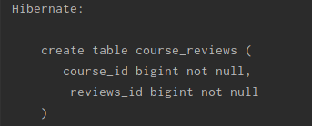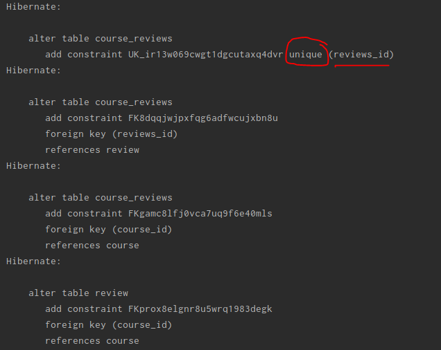 둘 사이의 관계 테이블이 자동으로 생성되고 多인 Review가 uniqe 제약조건이 걸려 Course는 여러개고 Review는 하나만 들어갈 수 있게 된다.