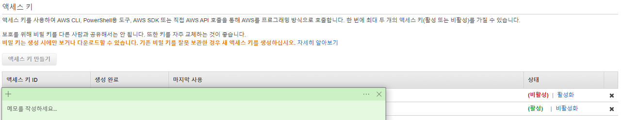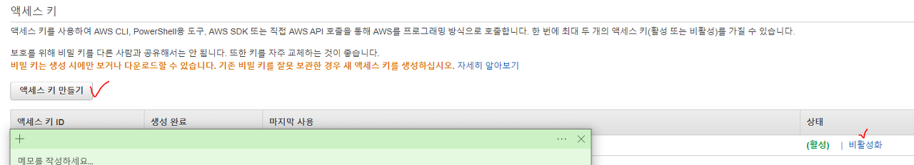 2. 보안 자격 증명 비활성화 & 엑세스 키 만들기
