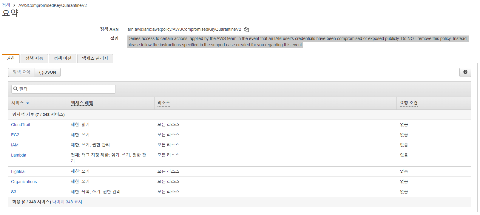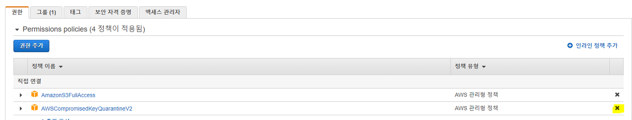 메일에서 온대로 AWSCompromisedKeyQuarantineV2 정책이 부여됐다.