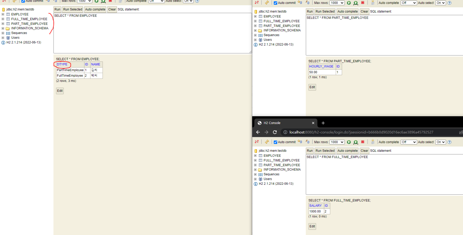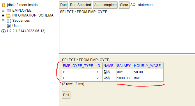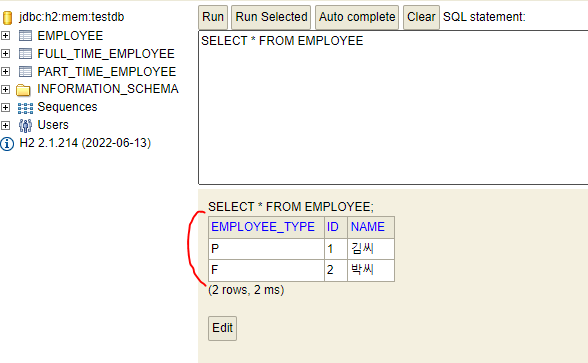 서버를 실행하면 이렇게 EMPLOYEE 하나의 테이블에 구분 컬럼과 자식 엔티티의 컬럼들이 모두 생성된 걸 볼 수 있다.