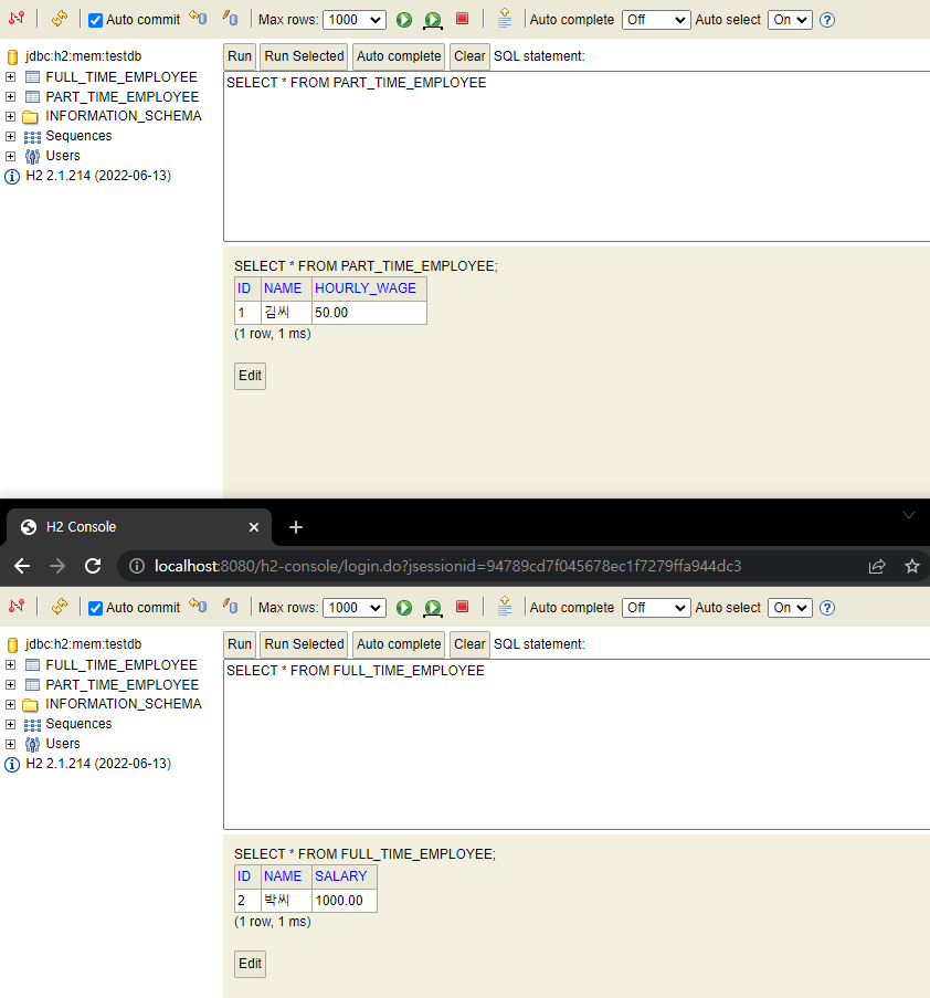 서버를 실행하면 이렇게 부모의 엔티티를 상속받은 자식 엔티티가 매핑된 테이블이 두개 생기고