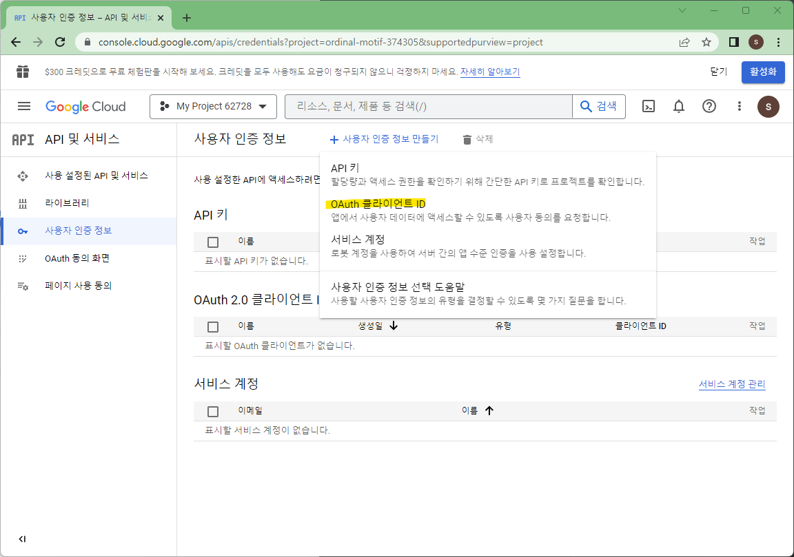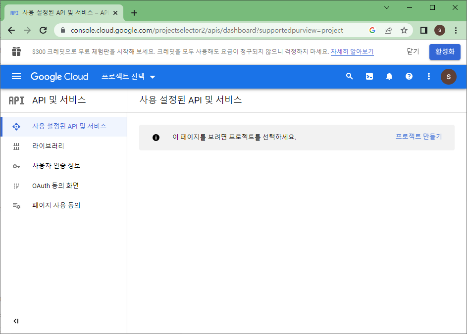 구글 개발자 콘솔 중 API 및 서비스에서 프로젝트를 하나 만들어준다.