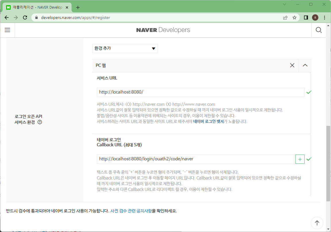 redirection url은 http://localhost:8080/login/ouath2/code/naver