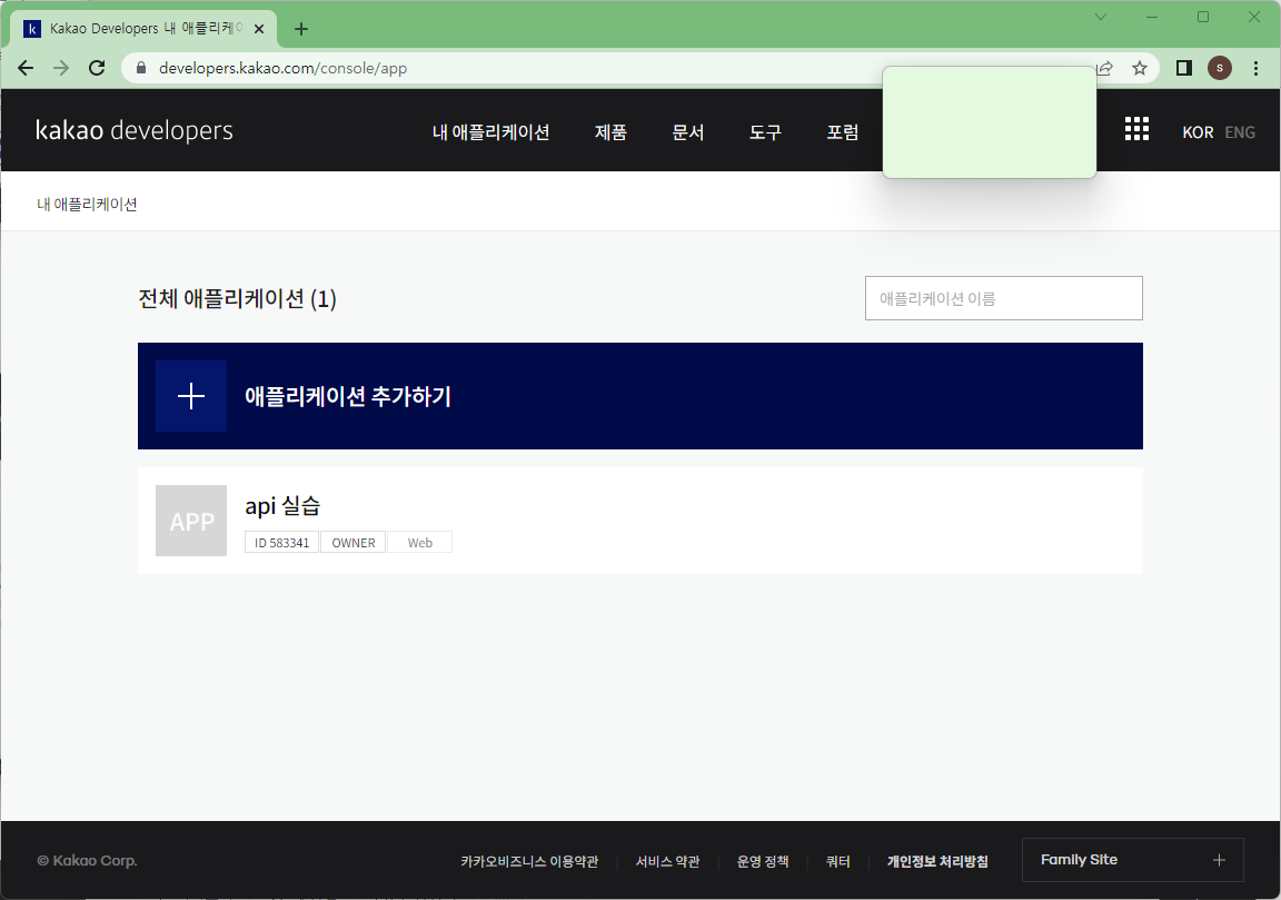 카카오는 애플리케이션을 먼저 추가해주고 나머지를 설정해준다.