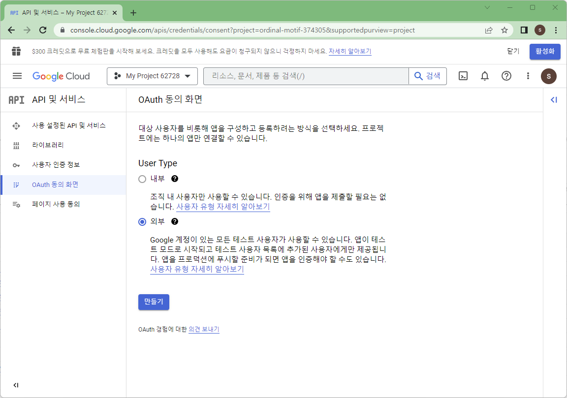 메뉴의 OAuth 동의 화면을 외부로 만들어준다.