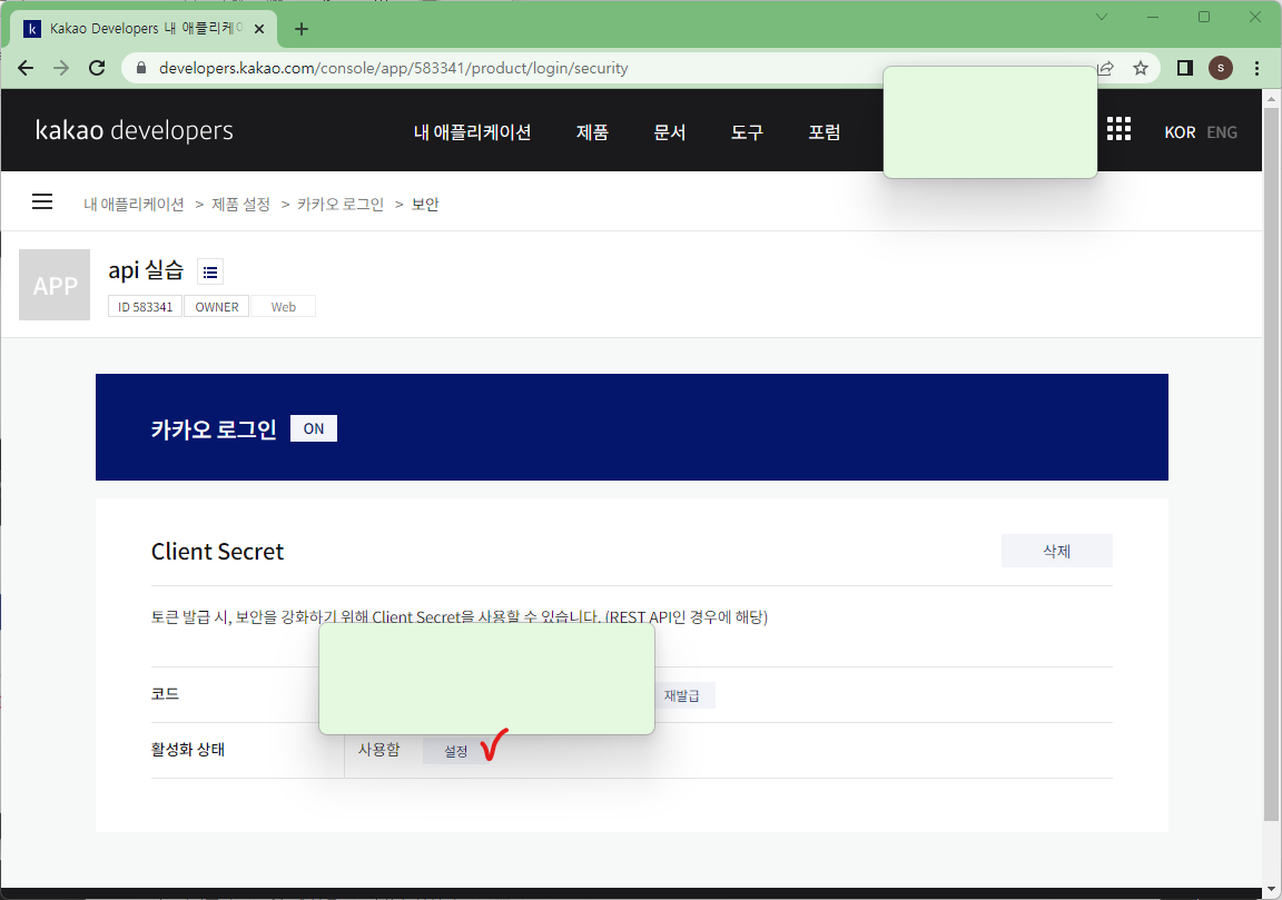 보안에서 카카오 로그인도 활성화해주고 코드도 복사해둔다. client secret으로 사용될 것이다.