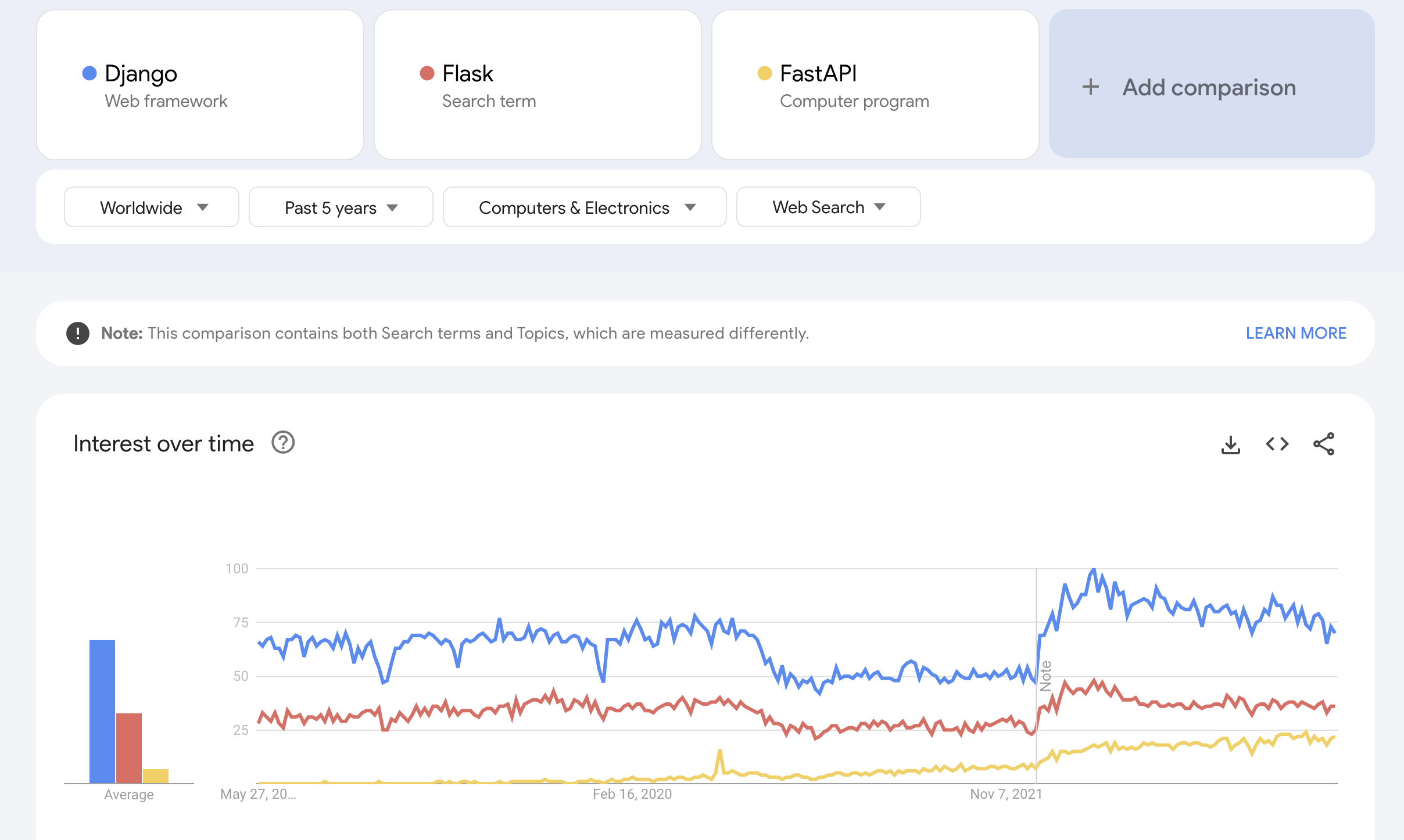 FastAPI가 Flask를 거의 다 따라잡아 이제는 둘의 인기가 비등비등한 걸 볼 수 있다.