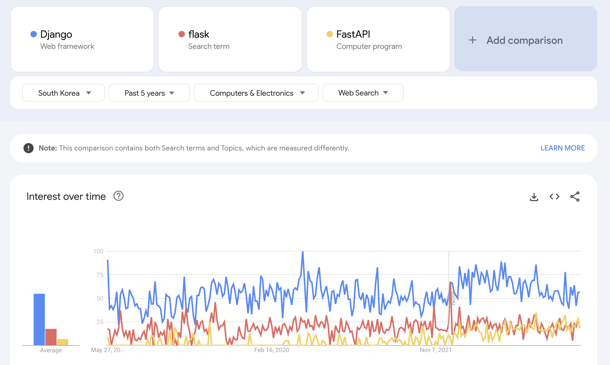 5년을 기간으로 검색을 해보니 여전히 장고가 1위이지만 FastAPI의 기세가 만만치 않다.