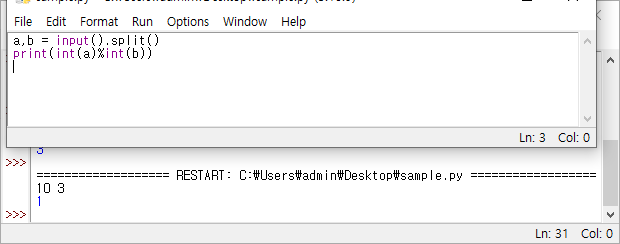 정수 2개(a, b) 를 입력받아 a를 b로 나눈 나머지를 출력해보자.