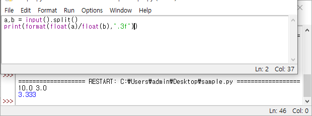 print(format(float(a)/float(b),".3f"))