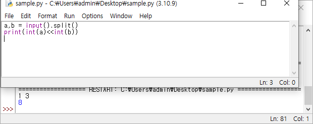 정수 2개(a, b)를 입력받아 a를 2b배 곱한 값으로 출력해보자.