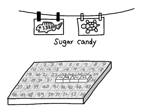 막대에 있는 설탕과자 이름 아래에 있는 번호를 뽑으면 설탕과자를 가져가는 게임이었다.