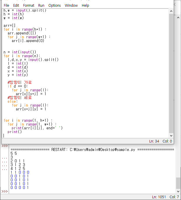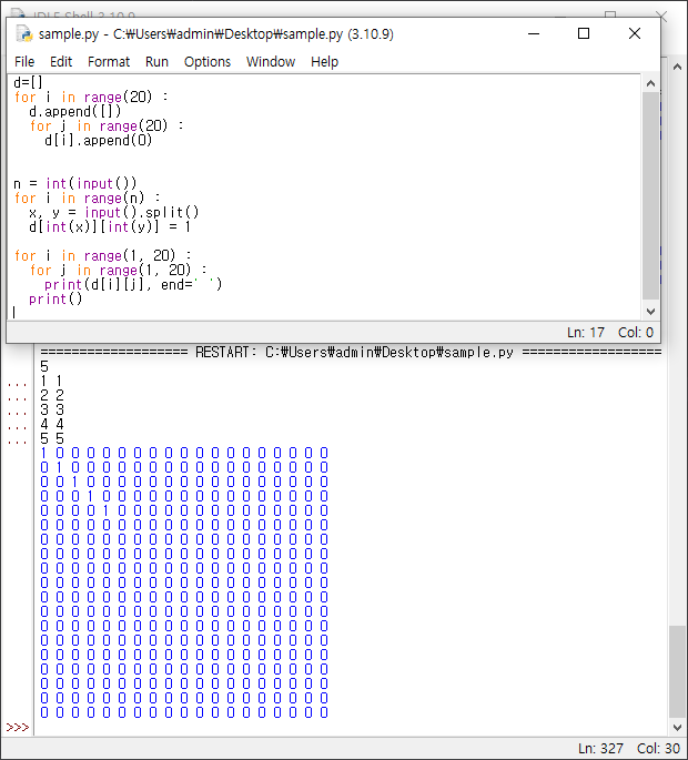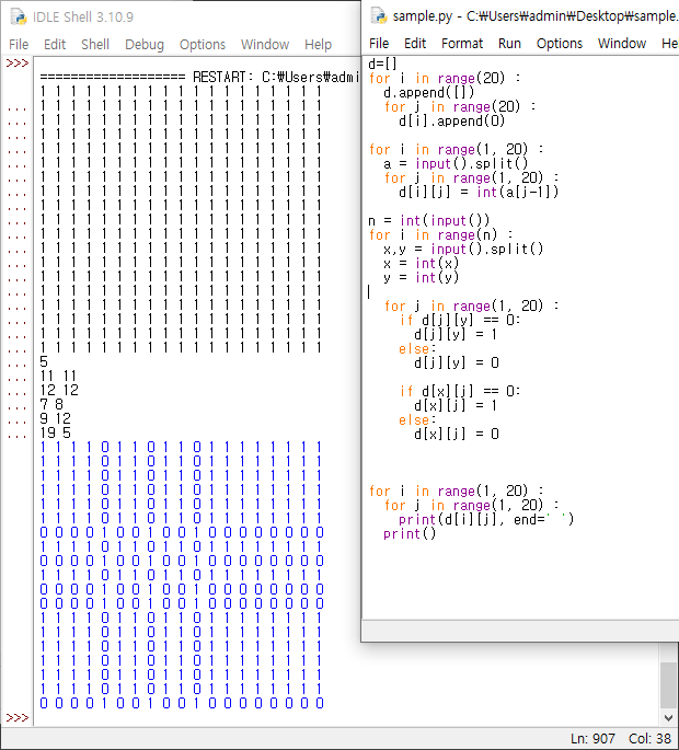 d[int(x)][int(y)] = 1