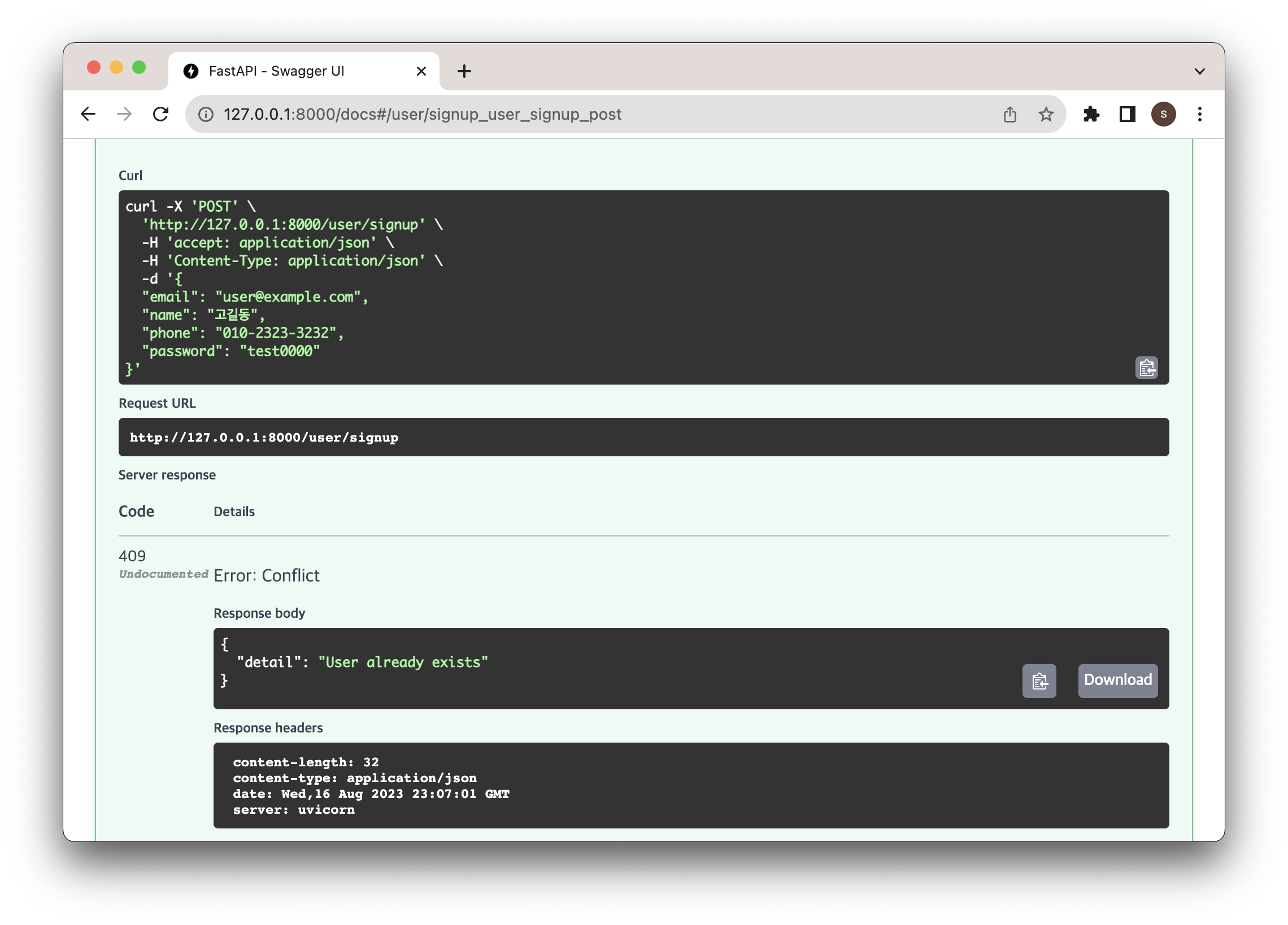 한번 더 요청보내보면 이미 존재하는 회원이기에 409 에러를 뱉는 걸 볼 수 있다.