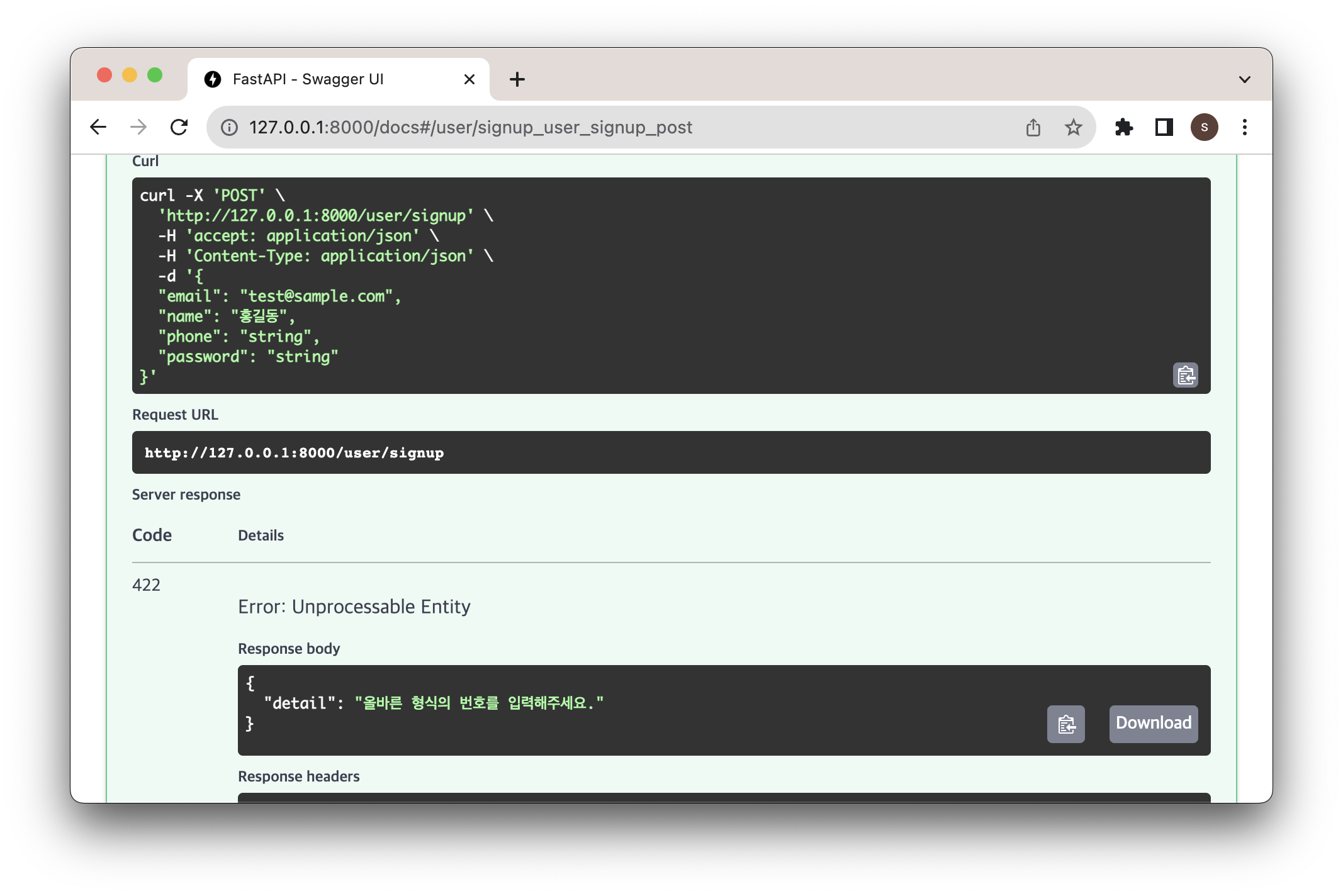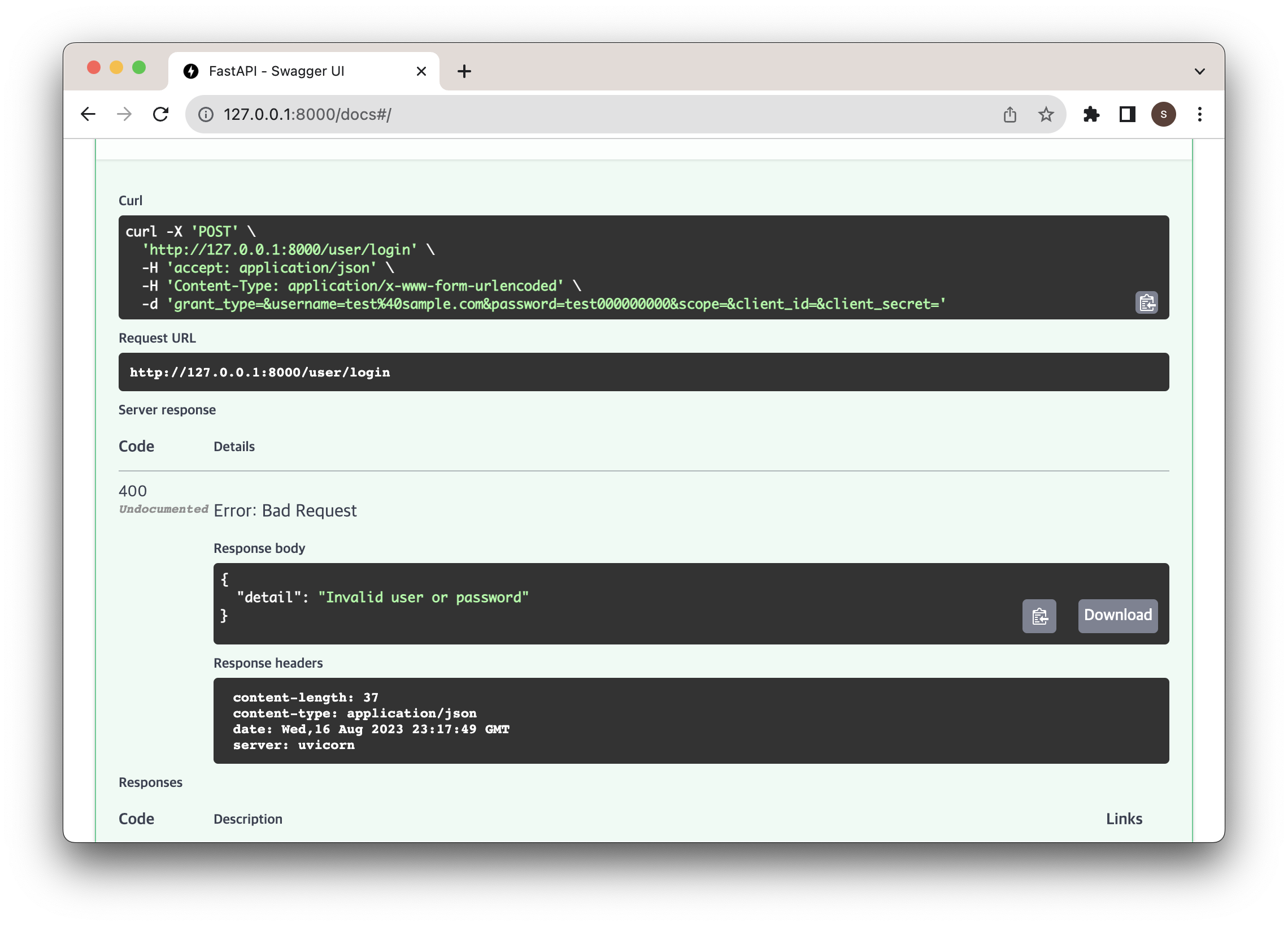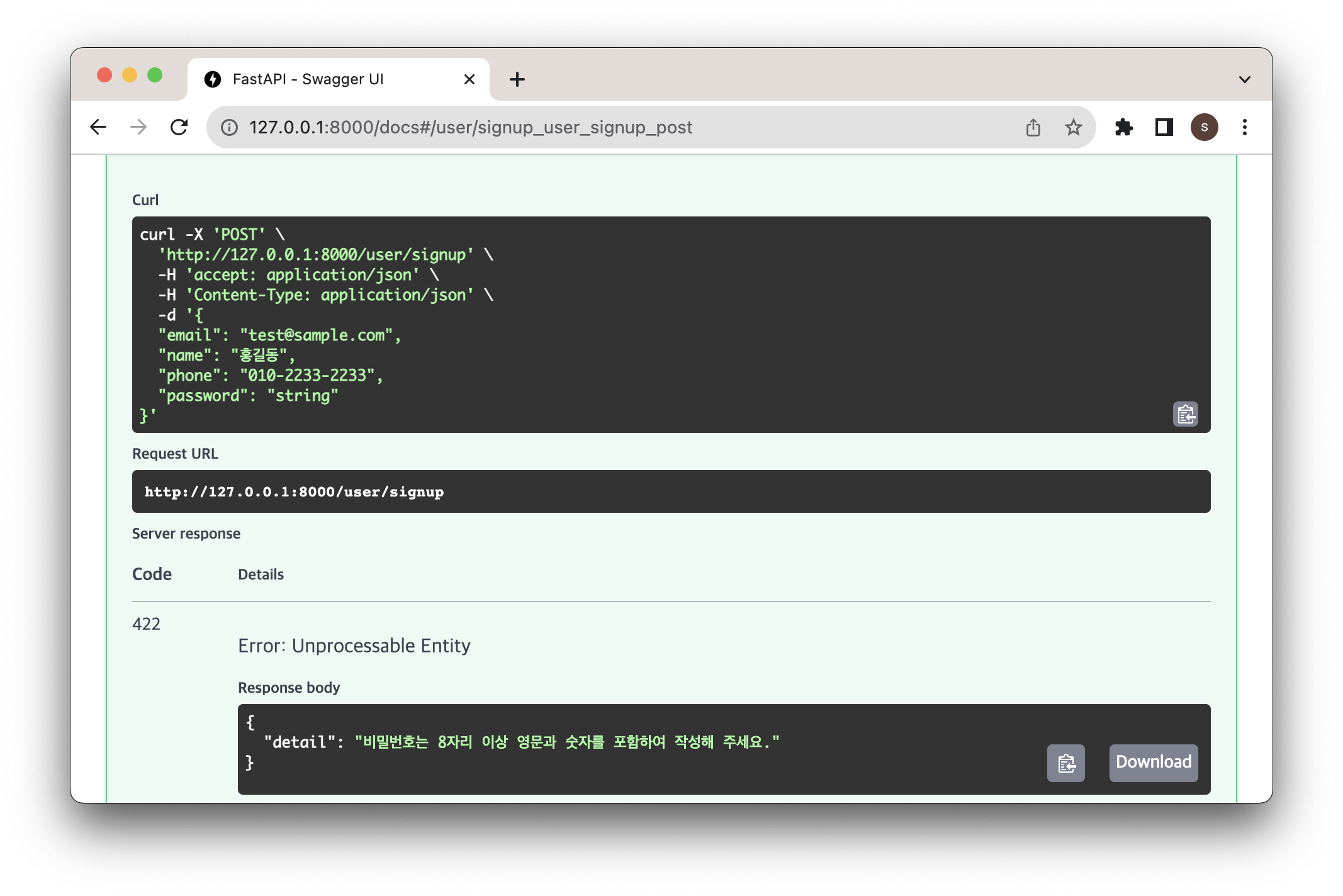 비밀번호를 다르게 써서 전달해보면 400 에러가 뜬다.
