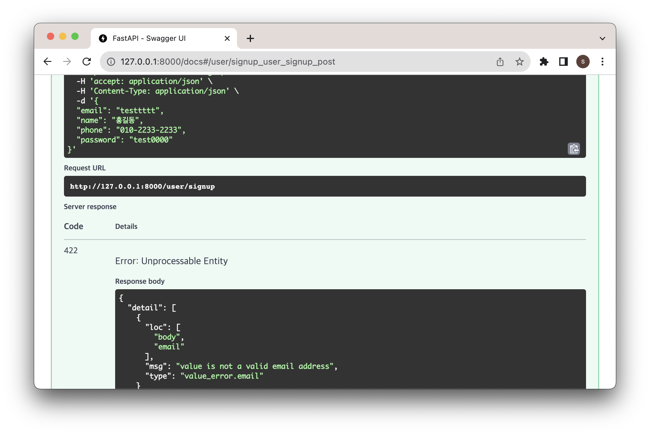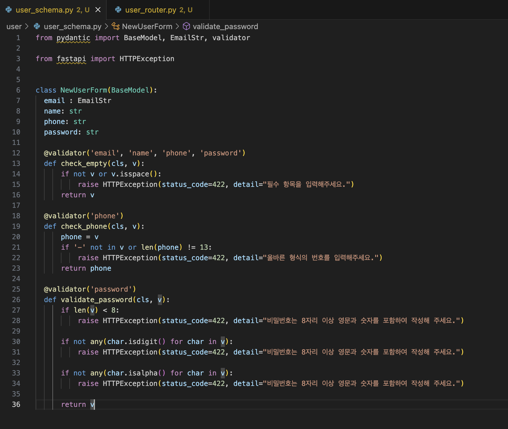 email의 타입을 EmailStr로 바꿔주고 @Validator를 추가해줘서 유효성 검증을 진행할 수 있다.