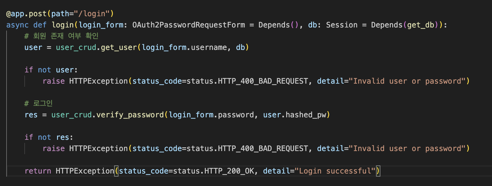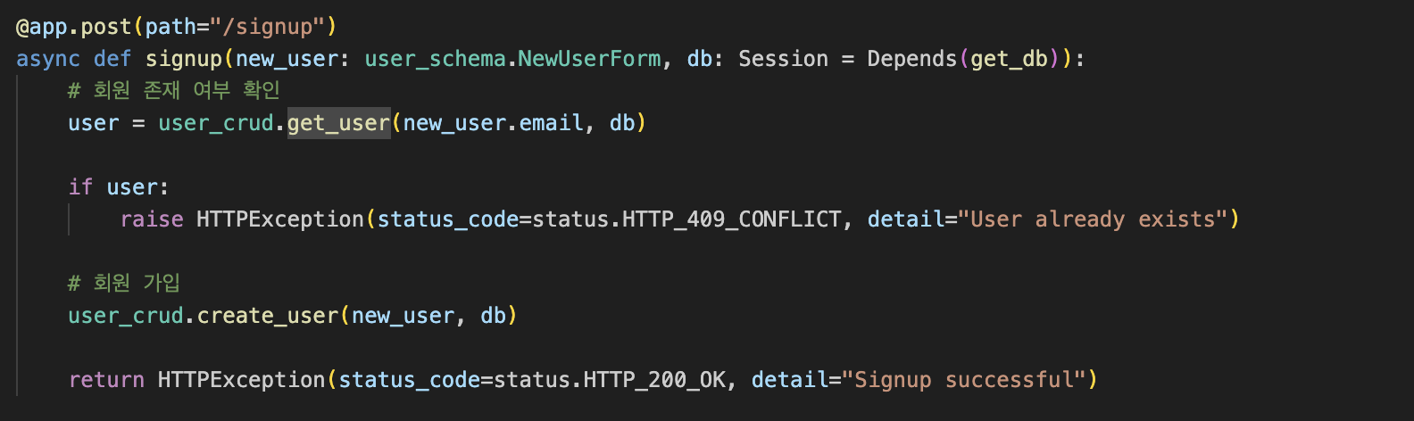 일단 로그인을 하면 해당 회원이 존재하는지 확인을 해야한다. 아까 만들어둔 get_user을 재 사용해준다.