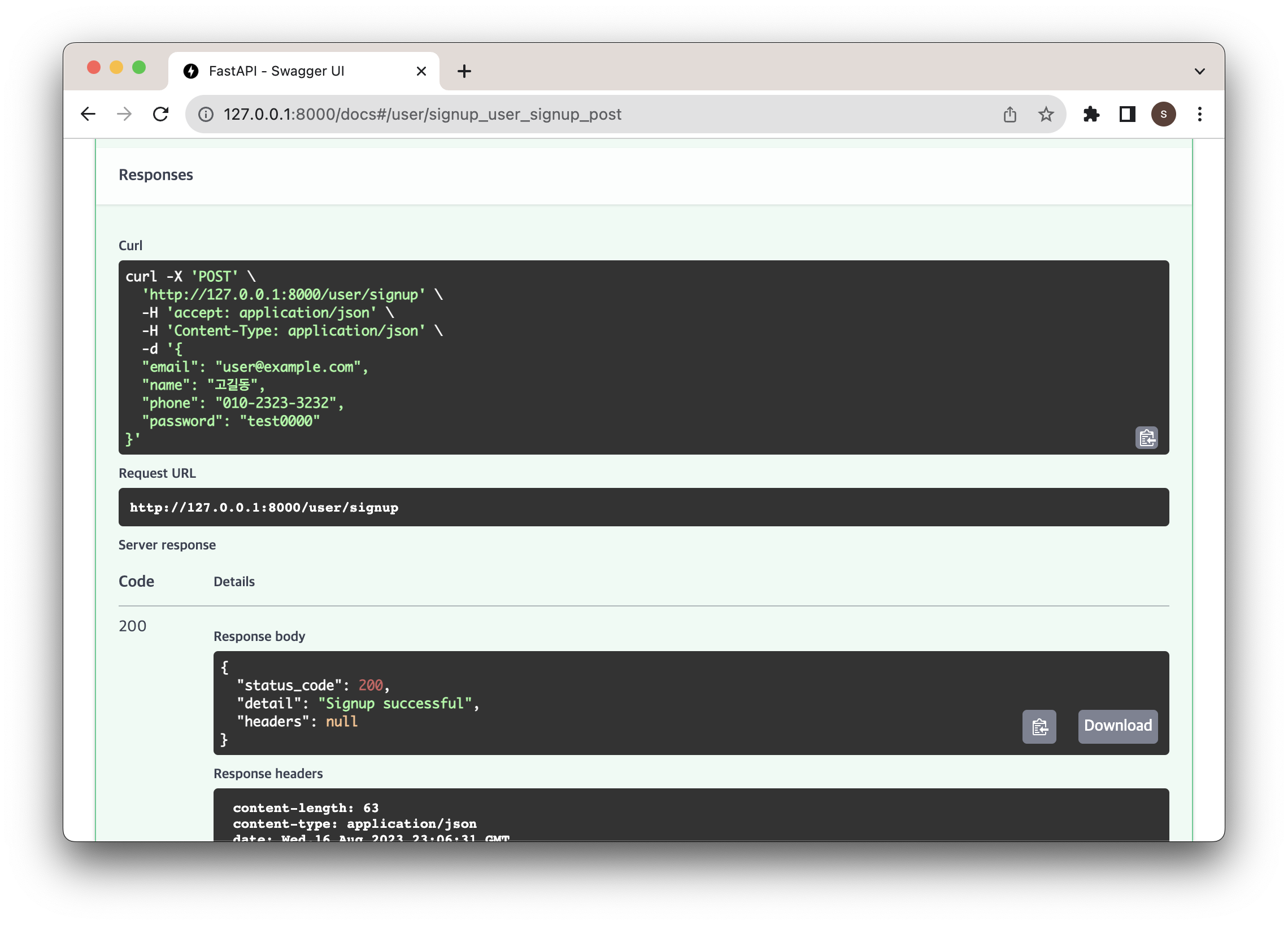 모든 유효성 검증에 통과해 상태값 200을 응답받은 걸 볼 수 있다.