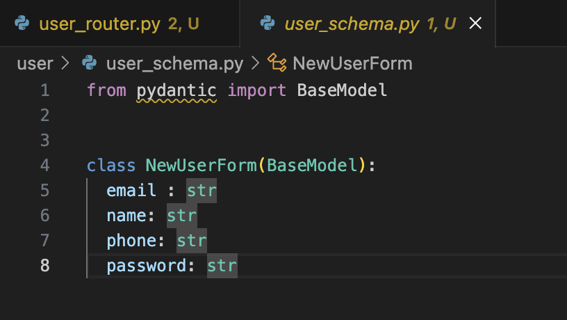 해당 메서드는 data form형식으로 회원 정보를 받아 처리를 해줘야 하니 일단 스키마를 만들어줬다.