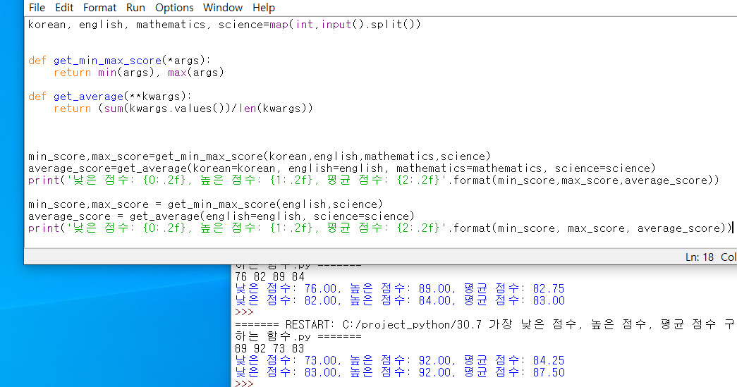낮은 점수: 83.00, 높은 점수: 92.00, 평균 점수: 87.50