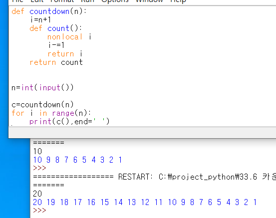 표준 입력으로 정수가 입력됩니다. 다음 소스 코드를 완성하여 함수 c를 호출할 때마다 숫자가 1씩 줄어들게 만드세요. 여기서는 함수를 클로저로 만들어야 합니다. 정답에 코드를 작성할 때는 def countdown(n):에 맞춰서 들여쓰기를 해주세요.