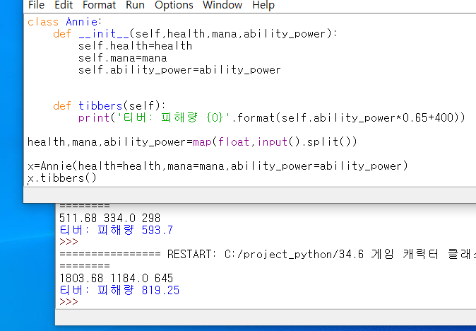 표준 입력으로 게임 캐릭터 능력치(체력, 마나, AP)가 입력됩니다. 다음 소스 코드에서 애니(Annie) 클래스를 작성하여 티버(tibbers) 스킬의 피해량이 출력되게 만드세요. 티버의 피해량은 AP * 0.65 + 400이며 AP(Ability Power, 주문력)는 마법 능력치를 뜻합니다.