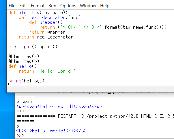 표준 입력으로 HTML 태그 이름 두 개가 입력됩니다. 다음 소스 코드에서 함수의 반환값을 HTML 태그로 감싸는 데코레이터를 만드세요. HTML 태그는 웹 페이지에 사용하는 문법이며 <span>문자열</span>,<p>문자열</p>처럼