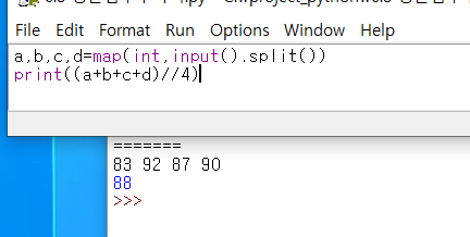 표준 입력으로 국어, 영어, 수학, 과학 점수가 입력됩니다. 평균 점수를 출력하는 프로그램을 만드세요.(input에서 안내 문자열은 출력하지 않아야 합니다) 단, 평균 점수를 출력할 때는 소수점 이하 자리는 버립니다. (정수로 출력)
