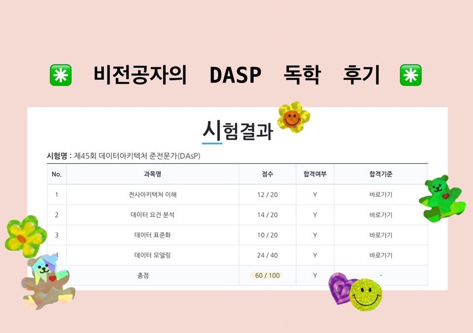 🎫 DAsP 자격증 정보, 후기, 공부법 비전공자의 DAsP 독학하기 (2020년 45회차 / 요약본 공유) sqld를 취득하고 dasp도 도전해봐야겠다는 생각이 들었다. sqld 후기는 여기! 2020/08/08 - [Big Data_Review/IT자격