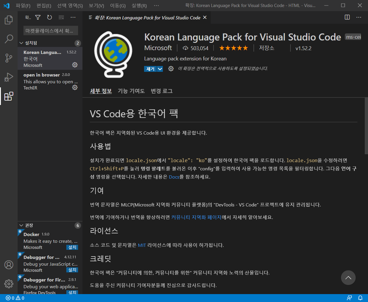 또 실습을 좀 더 수월하게 하기 위해 한국어 팩을 추가로 다운 받았다.