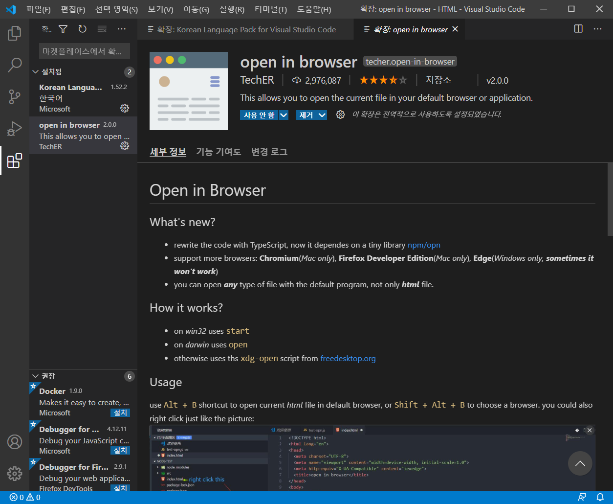 또 비주얼 스튜디오에서 바로 웹페이지를 실행시키는 팩도 추가로 다운 받았다.
